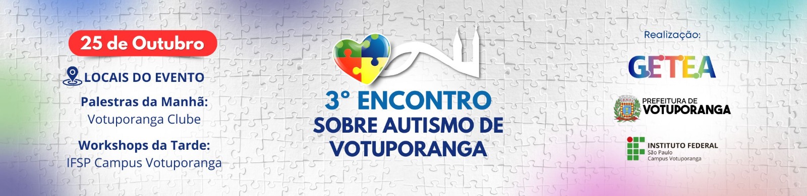A cidade de Votuporanga sediará, em 25 de outubro de 2025, o evento gratuito 3º Encontro sobre Autismo de Votuporanga, organizado pela Secretaria Municipal de Educação de Votuporanga, GETEA (Grupo de Estudos sobre Transtorno do Espectro Autista) e IFSP Votuporanga.
